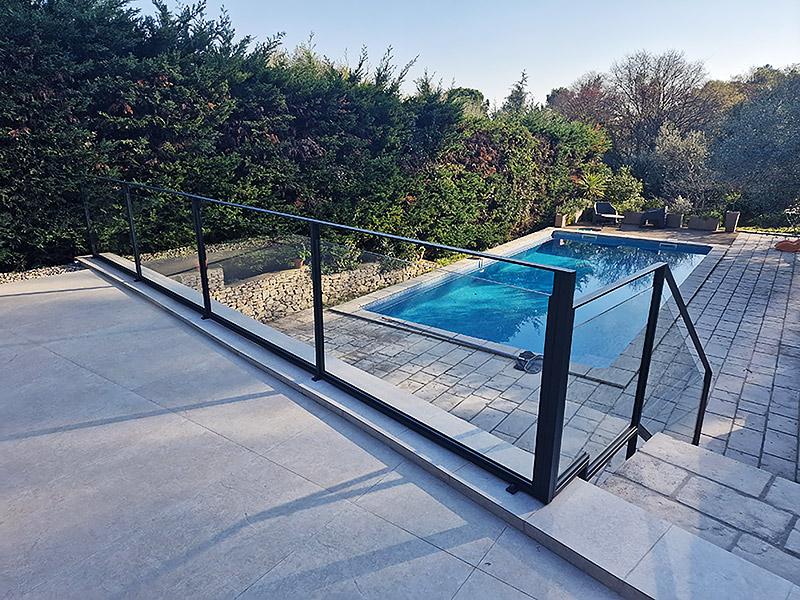 Verre feuilleté 44:2, les gardes corps sont thermolaqué ral 7016 gris anthracite.