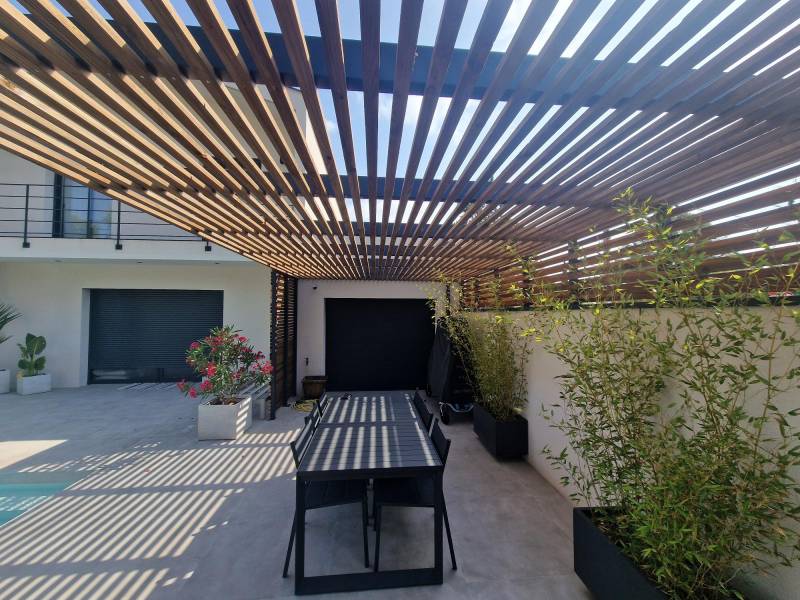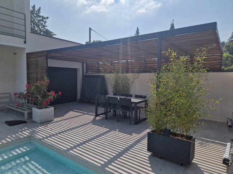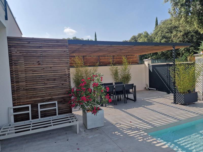 Réalisation d'une pergola en acier noir et lames de bois à Montpellier.